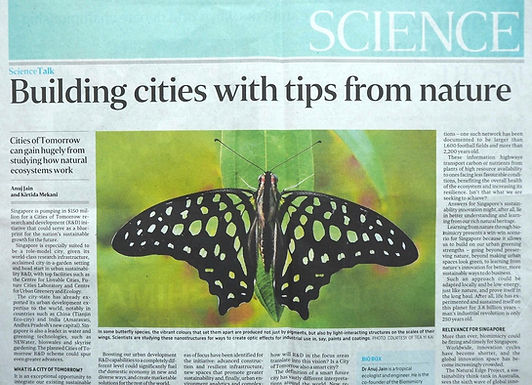 Dr. Anuj Jain and Mrs. Kirtida Mekani wrote in STRAITS TIMES today about how answers to Singapore's sustainability innovation might, after all, lie in better understanding and learning from our rich natural heritage. Singapore has already championed tropical urban greenery and is one of the world’s most biodiverse cities. Can we also be champions in innovation from nature in the tropics, and spur a new generation of nature-inspired entrepreneurship? We will need to inculcate a practice of viewing nature as our classroom - a model, a measure and a mentor.