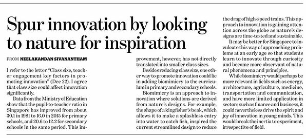 Mr. Sivanatham Neelakandan writes in TODAY newspaper (December 23rd, 2016 issue) about how biomimicry could be a way to promote innovation in Singapore, particularly by adding biomimicry to the curriculum in primary and secondary schools. Applications of biomimicry are evident across disciplines such as engineering, energy, architecture, and transportation but few people know that the concepts have been applied to design better financial models, more resilient businesses, and more effective communications. We are thankful that Siva has kicked off discussions about biomimicry and innovation. Biomimicry Singapore is preparing a full-blown article on this issue. Stay tuned!
